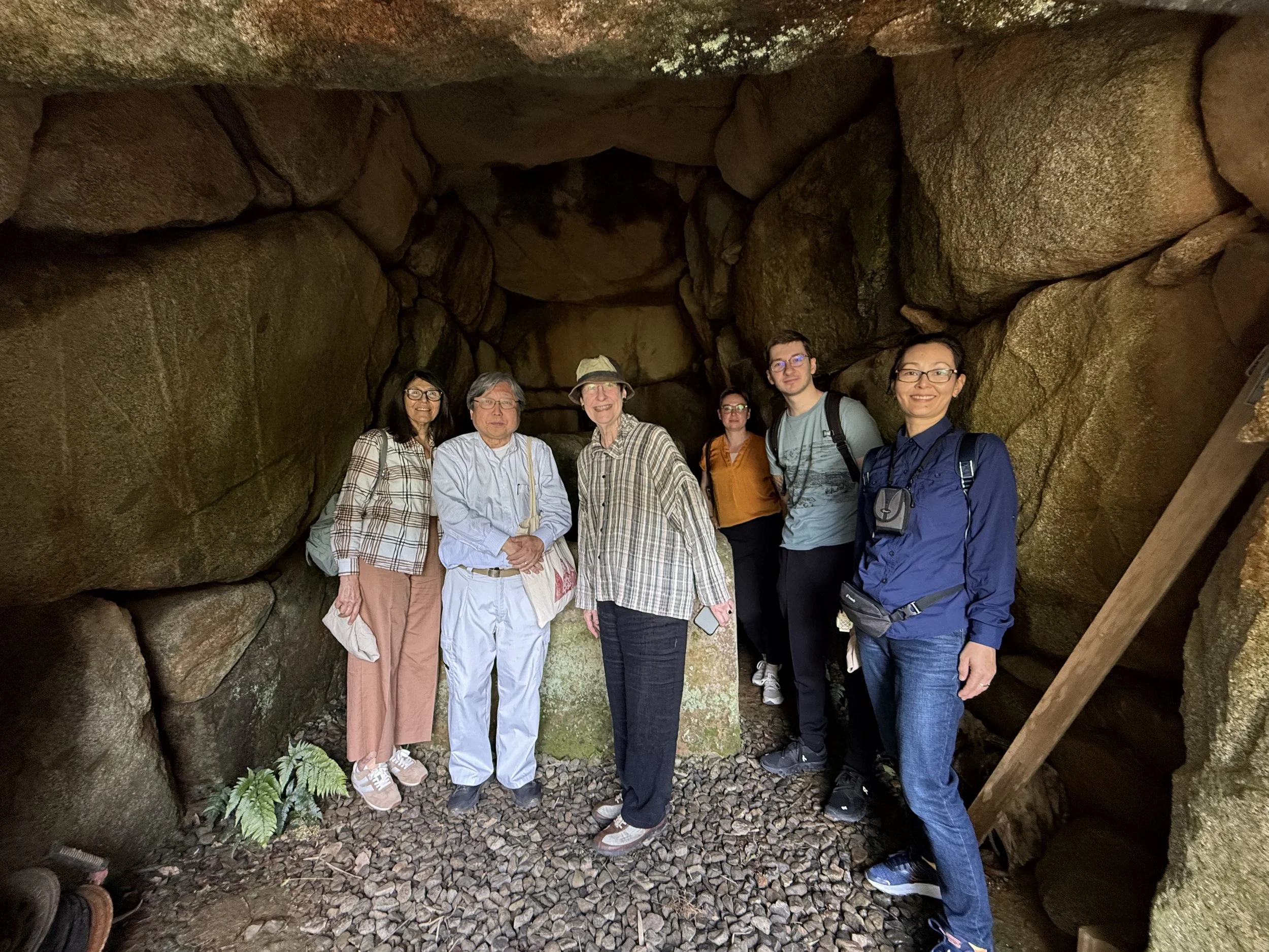 In Gunma at the Yama no Ue stele, I was able to stand right beside writing from the seventh century after representatives from the city came out to open the buildings containing the stele and answer our questions. The stele, one of three we visited across Gunma, contained a declaration of Buddhist devotion by a man and notes about the efforts of his mother for the relatively new religion. Beside the stele was a modest mounded tomb, one built at the end of the period of such tomb-building. This stele and tomb formed a bridge from the Kofun period into the Asuka for me; local elite families throughout the archipelago transitioned from building monumental tombs to building Buddhist temples instead, and here was evidence of Buddhist faith and practice far from the courts of the Kinai, just beside a tomb. After studying the writing carved into the stele, we walked outside and stared at the mounded tomb. Because this was a smaller tomb, unlike the monumental tombs that are protected and restricted in other parts of Japan that I had seen on prior trips to Japan, it was possible to go inside and experience this space.